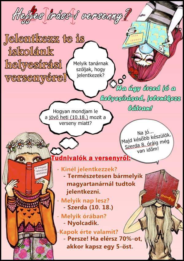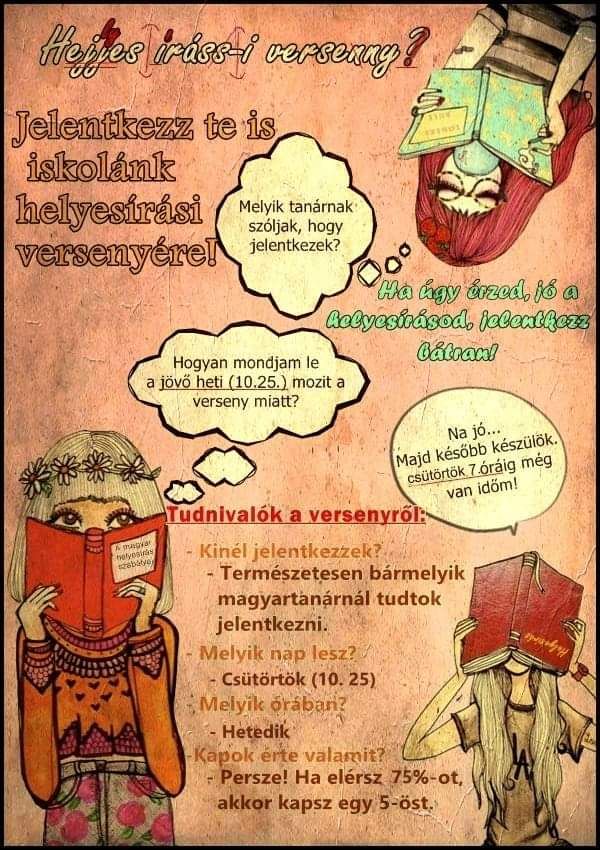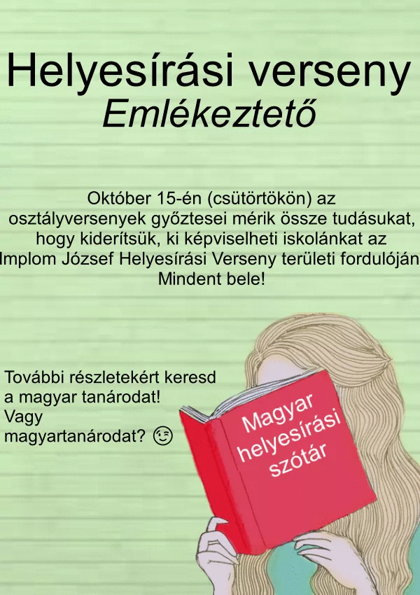 Október 14-én (szerdán) a 7. órában iskolai helyesírási verseny lesz. Aki eléri az 50 %-os eredményt, a hagyományhoz híven automatikusan kap egy 5-öst nyelvtanból. :) A győztes pedig képviseli majd iskolánkat az Implom József helyesírási versenyen.