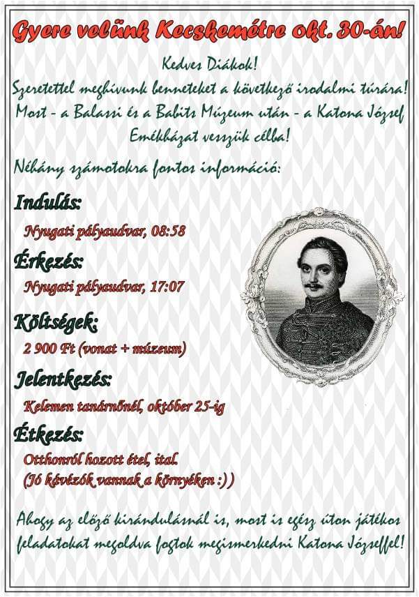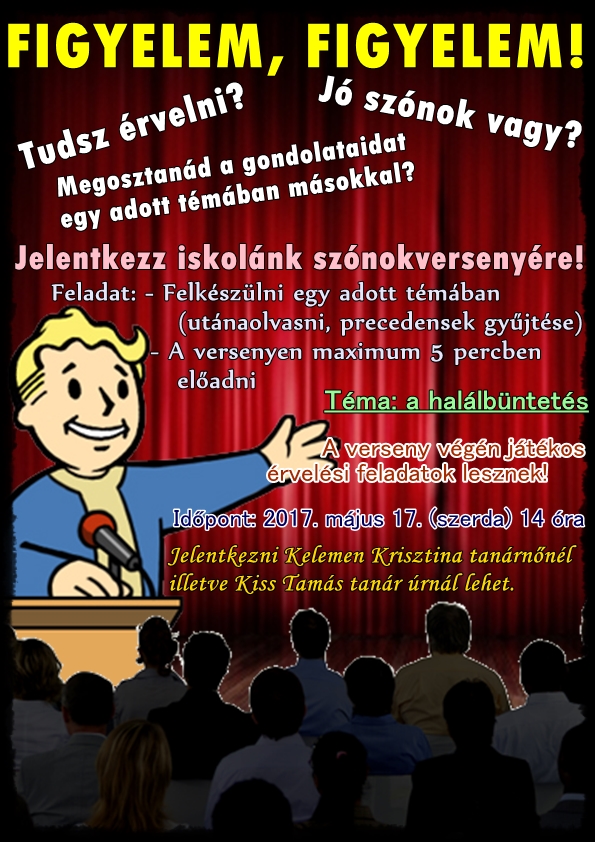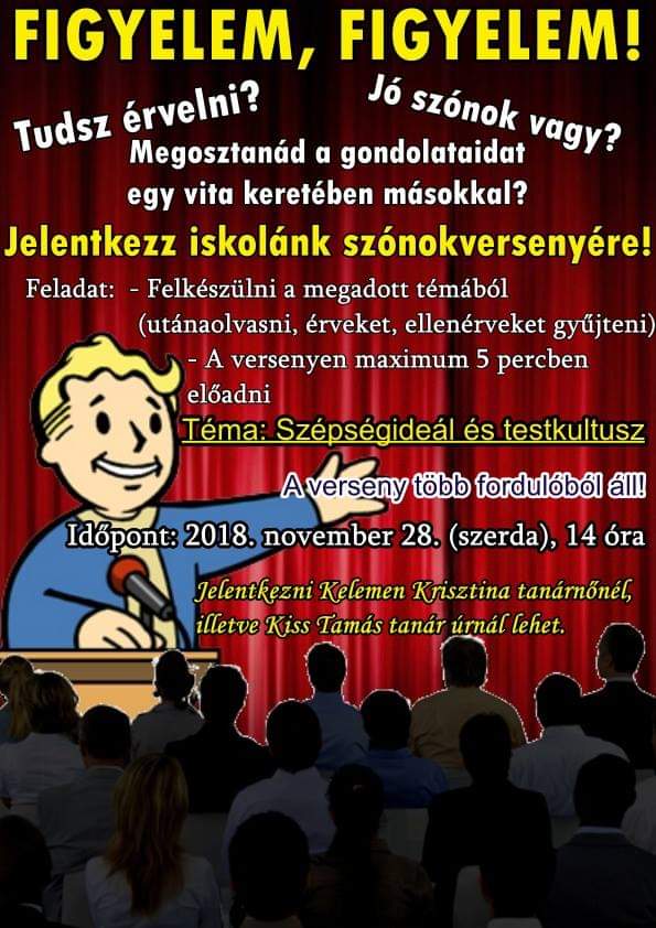 A Kazinczyról elnevezett "Szép Magyar Beszéd" verseny iskolai fordulóját 2017. február 1-jén szerdán, a 310-es teremben tarjuk. A verseny 14:00-kor kezdődik. Pontos megjelenést kérünk!