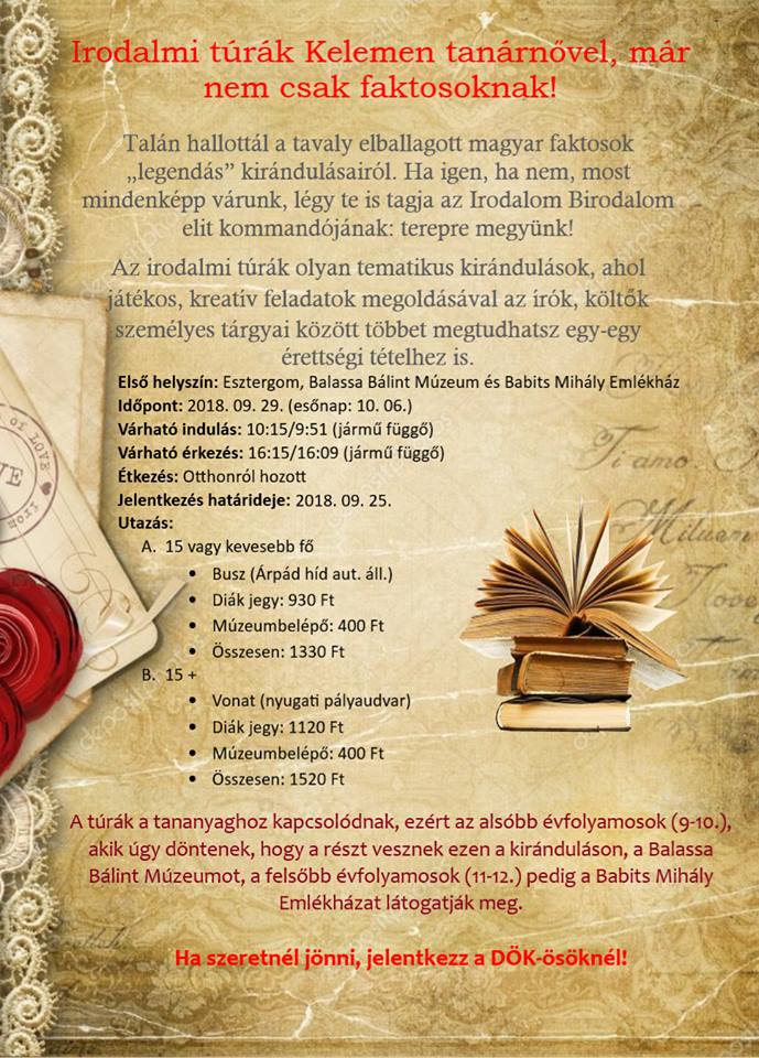 Szeptember 28-án a magyar fakultációs csoport meglátogatta a Petőfi Irodalmi Múzeumot. Diákjaink egy interaktív tárlatot tekinthettek meg Petőfi Sándor életéről. Legtöbbjük szerint a tárlat legizgalmasabb része egy Petőfi társalgását megjelenítő hologram volt.