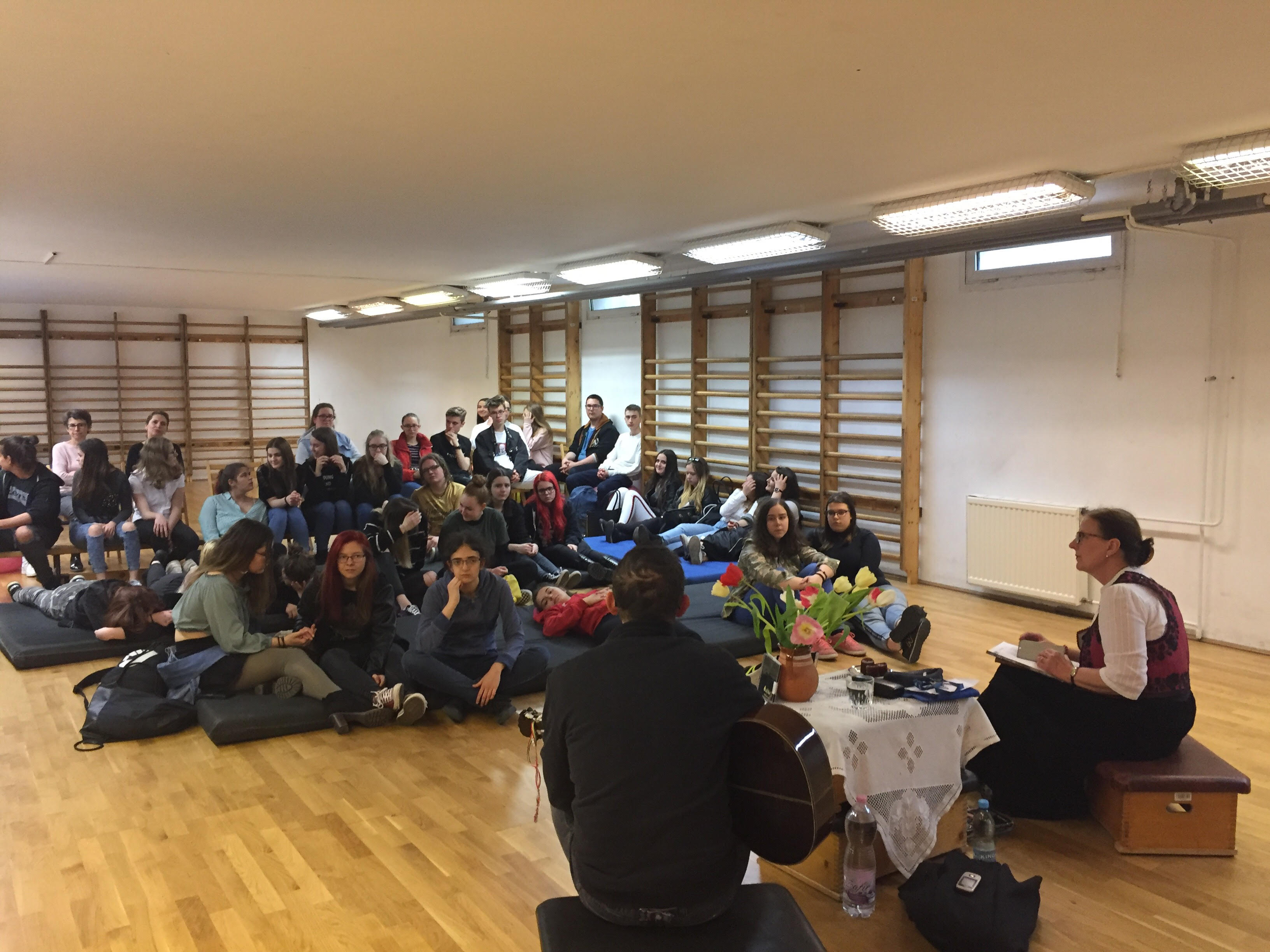Április 11-én, a költészet napján meghívott vendégünk Mile Zsigmond költő és zenész volt. Délelőtt rendhagyó irodalomórákon lehetett Vele találkozni. A 7. órában pedig - mivel az eredetileg elgondolt helyszín, a könyvtár kicsinek bizonyult :) -, vendégünk a Tükrös teremben mesélt, zenélt, verselt nekünk. Jó költőt, hiteles embert ismerhettünk meg személyében. A Vele való találkozásokban újraélhettük: szöveg és dallam édestestvérek!