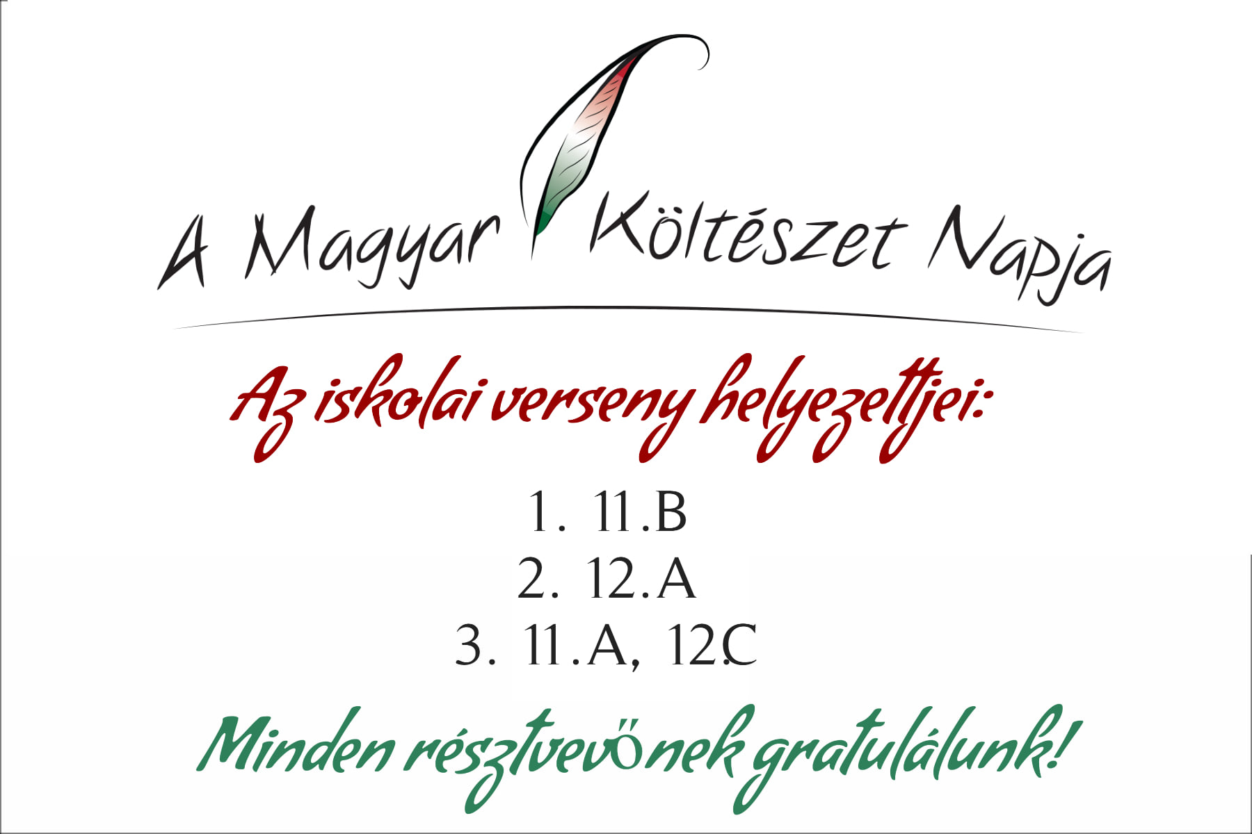 A Kazinczyról elnevezett "Szép Magyar Beszéd" verseny iskolai fordulójának első helyezettje: Tarjáni Nikolett. A fővárosi fordulón ő fogja iskolánkat képviselni. A megosztott második helyezést Szigeti Bence és Szabados Endre kapta. Mindhárman a 10.A osztály tanulói.