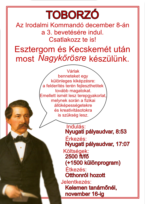 Az irodalmi kommandó október 28-án bevette a visegrádi fellegvárat. A megszokott játékos magyar feladatok mellett rendhagyó módon történelmi kérdésekre is válaszolniuk kellett a kirándulóknak. Mátyás király, Janus Pannonius és Katona Bánk bánjának nyomában kellett járniuk. A felderítő munkát Vereczkei Gyöngyvér tanárnő, Kelemen Krisztina tanárnő és egy veterán kommandós, Gönczi Emese készítette elő.