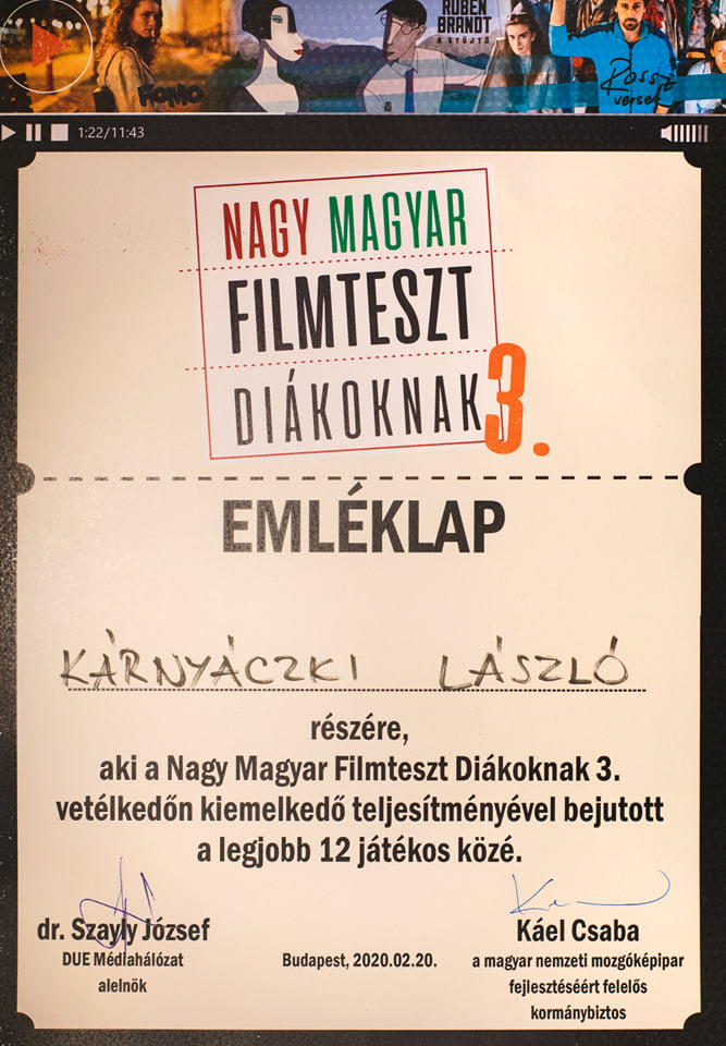 Kárnyáczki László (11.B) a Diákújságírók Egyesülete által szervezett Nagy Magyar Filmteszten 4. helyezést ért el.