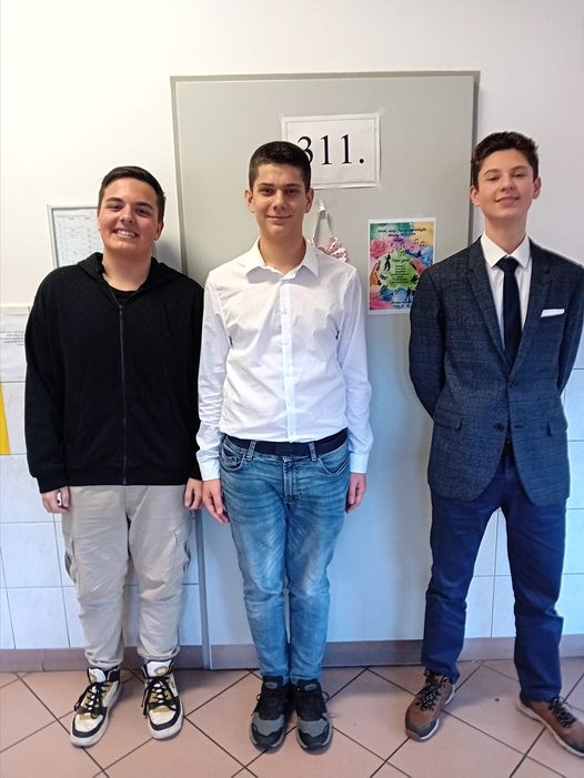 A Szép magyar beszéd verseny iskolai fordulójának első három helyezettje (balról): Molnár Zalán 10. b, harmadik helyezett, tanára: Balogh Dávid. Forró Bende NYEK, első helyezett, tanára Ferencz-Balázs Nikolett. Ackermann Mátyás 9. b, második helyezett, tanára Kelemen Krisztina.